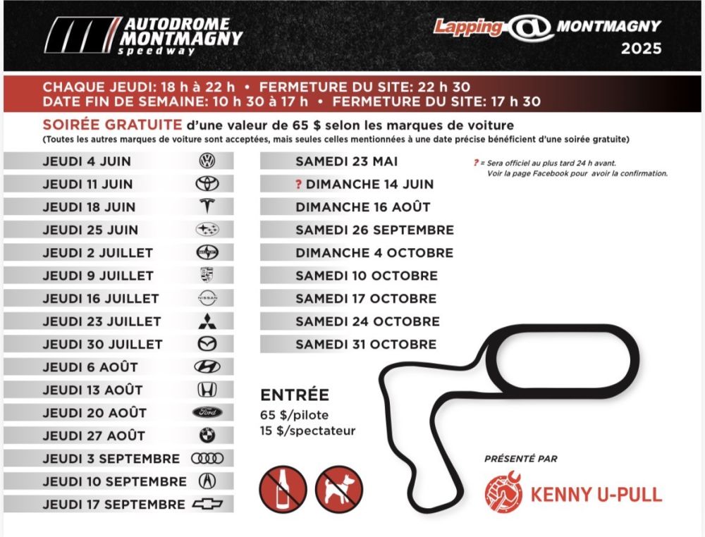 Présentées par Kenny U-Pull, les soirées de lapping du jeudi à l’Autodrome Montmagny débutent dès 18 h et offrent aux passionnés de conduite une occasion idéale de profiter du circuit dans un cadre sécuritaire et structuré.