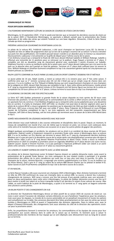 La direction de l’Autodrome Montmagny dresse un bilan positif de sa saison 2025 de courses de stock-car. Les mois à venir seront l’occasion de réévaluer certains éléments en vue d’améliorer l’expérience pour les amateurs, mais aussi pour les équipes. Le monde de la course automobile est en perpétuel mouvement et toutes les options sont actuellement sur la table. Des annonces devraient être faites prochainement en lien avec les séries qui seront invitées à Montmagny en 2026 et quant à l’organisation des divisions régionales. Dans le même sens, avec le départ d’Howard Romanado, des changements sont aussi attendus du côté de la direction des opérations stock-car pour la prochaine saison.